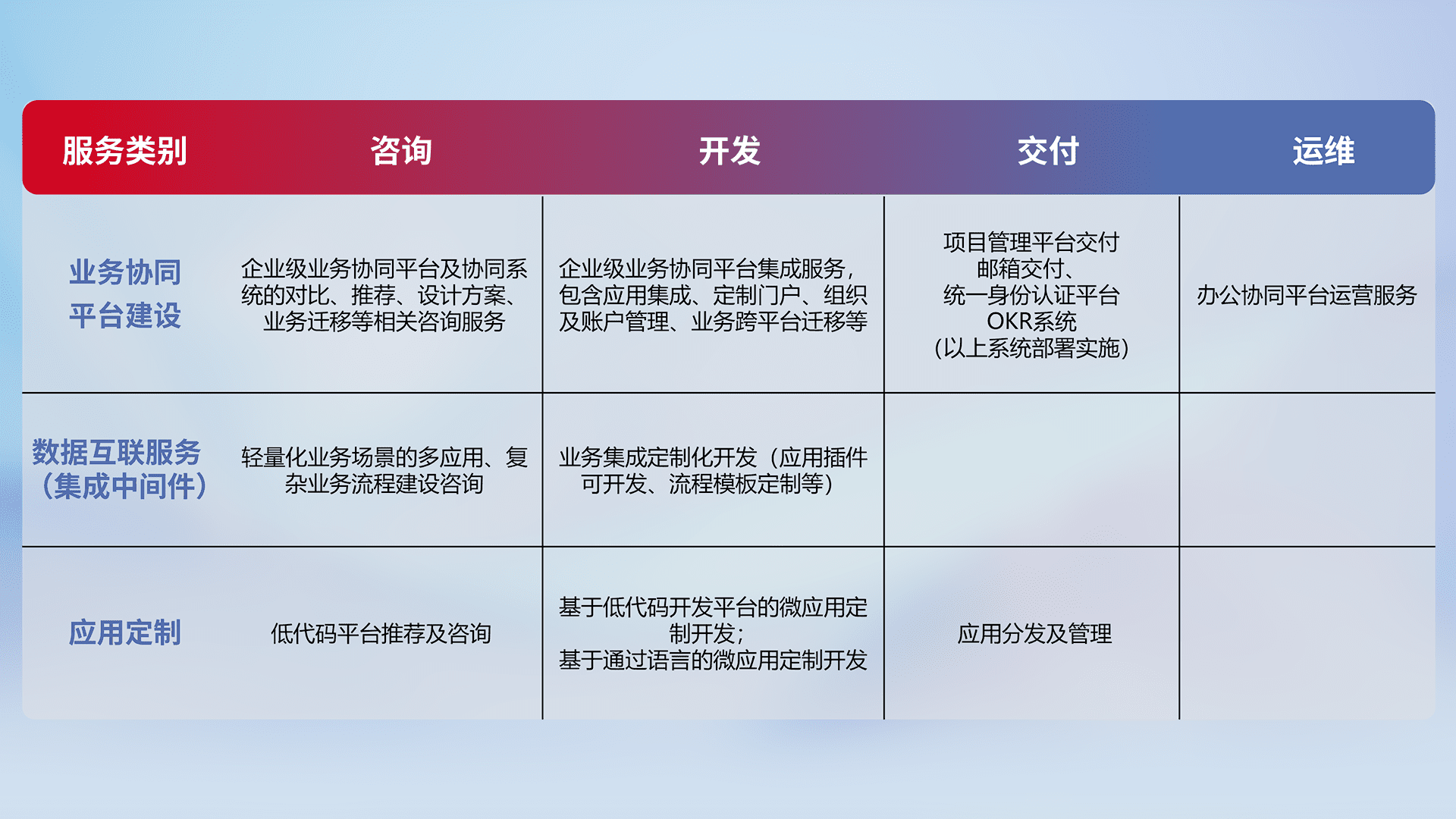 针对钉钉、、、、企微、、IDaas等平台级产品提供产品的规划、、、方案、、、、交付、、、、定制化开发等服务,,实现如统一协同办公、、、智能客户服务、、、混合会议管理、、、智能数据查询、、等业务场景,,,,实现数字化转型。。。。