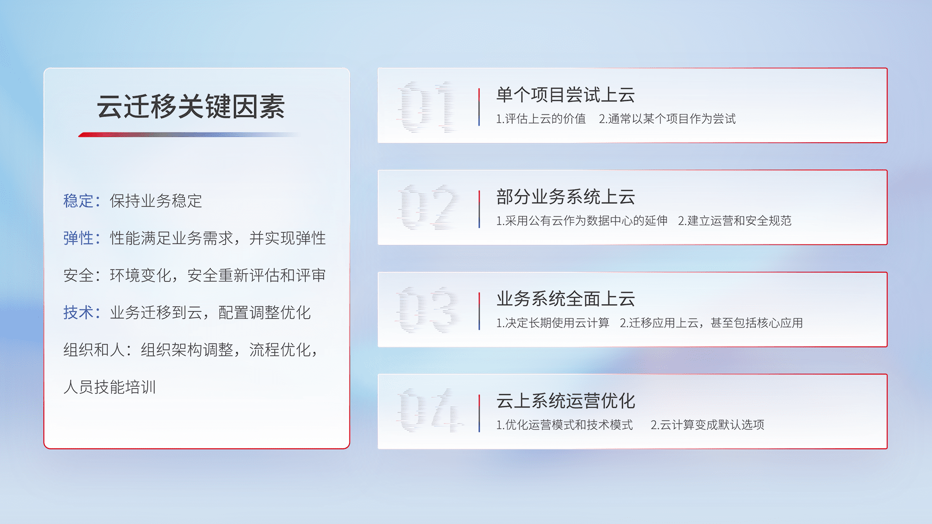 结合实际业务,,从规划设计、、、、云平台选型、、、、云原生改造、、、数据迁移、、、、集成交付,,,,迁移全过程为客户识别最佳上云路径,,,做好风险识别管理,,,,设计网络架构、、、身份权限、、、、安全审计合规、、操作审计、、、、日志审计、、监控告警策略、、多站点容灾设计等,,,,对云上基础设施进行整体规划,,提升IT治理水平,,,,以满足弹性、、高可用、、高性能的需求。。。。