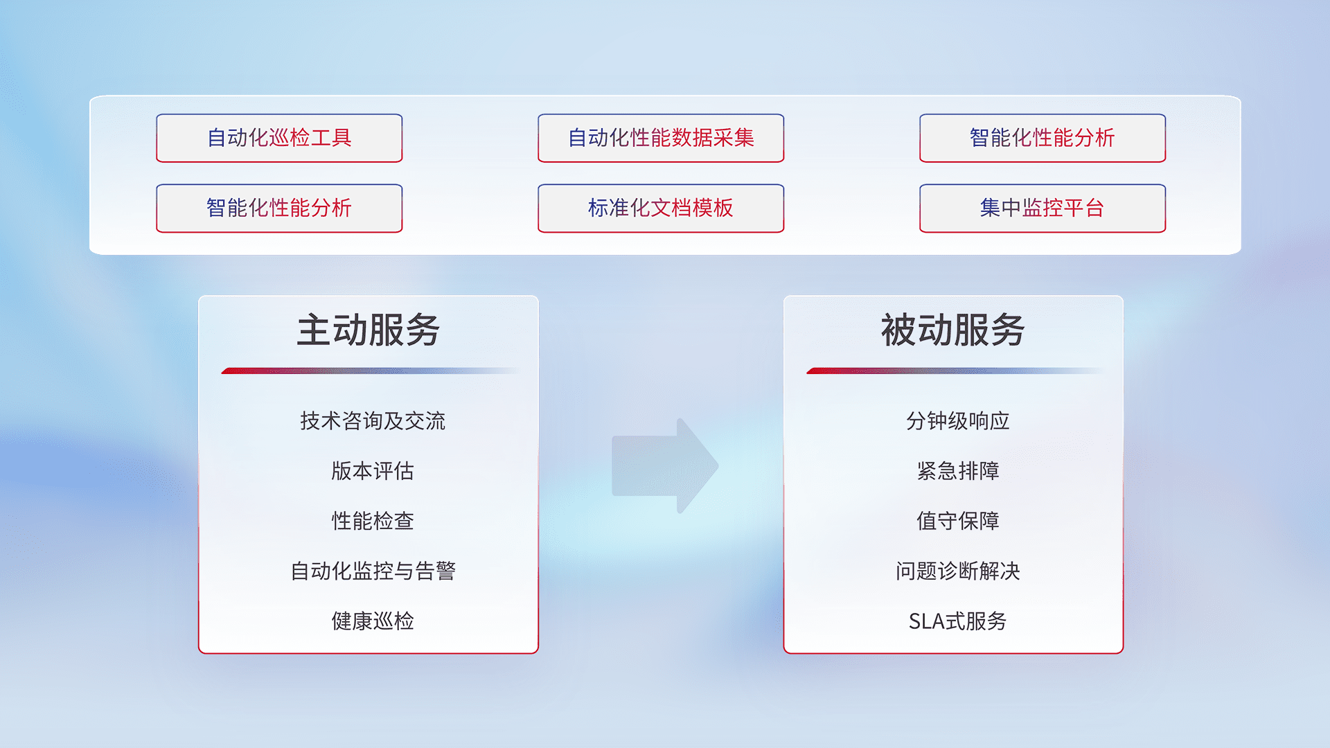 智能化工具和标准化文档,,,保障服务质量,,,提供主动服务(包含技术咨询、、版本评估、、、、性能检查、、、、自动化监控与告警、、、、健康巡检)和被动服务包含(分钟级响应、、、、紧急排障、、、、值守保障、、问题诊断解决、、SLA服务)。。。